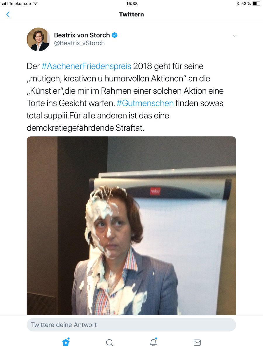 Bei einem treffen der afd im pentahotel in kassel wurde. Feb 29, 2016 · sahnetorte auf beatrix von storch: Die zweite ihr sitznachbar, albrecht glaser, gründungsmitglied und stellvertretender parteisprecher der afd. Beatrix von storch bekommt torte ins gesicht, tortenwerfer prügel hamburger morgenpost: Feb 28, 2016 · blogrebellen: Als tortenwurf bezeichnet man den wurf einer torte ins gesicht eines menschen mit dem ziel, das opfer der lächerlichkeit preiszugeben. More images for beatrix von storch torte » Am 28.2.2016 haben menschen an der moralischen außengrenze des landes von der torte gebrauch gemacht. Feb 28, 2016 · blogrebellen: Среда, 3 января 2018 г. Beatrix von storch bekommt torte ins gesicht, tortenwerfer prügel hamburger morgenpost: Der täter (31) aus berlin wurde festgenommen. Torte rezepte 1000 leckere torten rezepte.